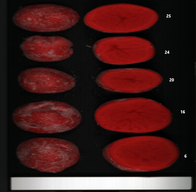 Technologisch gezien is het vraagstuk vrij snel op te lossen. Al langer wordt gebruik gemaakt van (Near-infrared) spectroscopie. Hiermee is non-destructief en zeer snel een breed beeld van de kwaliteit van onder meer aardappelen te bepalen, op basis van bijvoorbeeld het zetmeel- en vochtgehalte. Onderstaande figuur een aantal voorbeelden van de beelden die met spectroscopie zijn gemaakt.