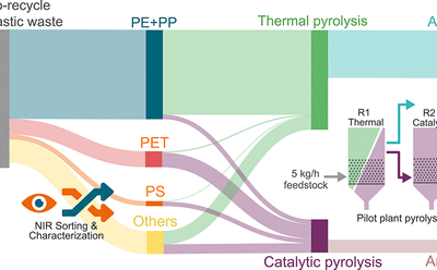 This study investigates the technological feasibility of recycling mixed plastic waste streams into chemical building blocks on a pilot scale. Postconsumer-separated DKR-350 mixed plastic waste was first separated into two fractions by using a two-step negative near-infrared (NIR) optical sorting process. The resulting two fractions (polyolefin-rich and polyolefin-poor) were subjected to thermal and ex situ catalytic pyrolysis, respectively. Both types of pyrolysis were performed in a fluidized bed pilot plant, continuously operated at feed rates of 5 kg h–1 and temperatures ranging from 460 to 550 °C. The polyolefin (PO)-rich fraction (∼81 wt % PE + PP) resulted in a maximum aliphatic-rich oil yield of 48 wt % and 26 wt % gas yield based on dry material intake. The PO-poor fraction, characterized by a lower PE/PP content (∼13 wt %) and high in PET and PS (43.5 and 14.4 wt %, respectively) normally unsuitable for efficient thermal pyrolysis, was processed through integrated cascading catalytic pyrolysis (ICCP) using a proprietary zeolite-based catalyst. This allowed for the successful transformation to 37 wt % aromatic-rich oil, with a total benzene, toluene, and xylenes (BTX) yield of 17 wt %, and 42 wt % gas. The high PET and PS content in the PO-poor fraction contributed to a significant increase in aromatic yields compared to the expected yield of a mixed plastic waste stream. This study thus demonstrates the potential to produce a full range of petrochemical building blocks, i.e., olefins and aromatics, from low-quality, hard-to-recycle plastic waste streams. Importantly, this work highlights that catalytic pyrolysis of the PO-poor residue stream, postsorting to yield PO-enriched streams, can effectively valorize this fraction, underscoring the technological viability of improved plastic recycling through targeted sorting and pyrolysis.